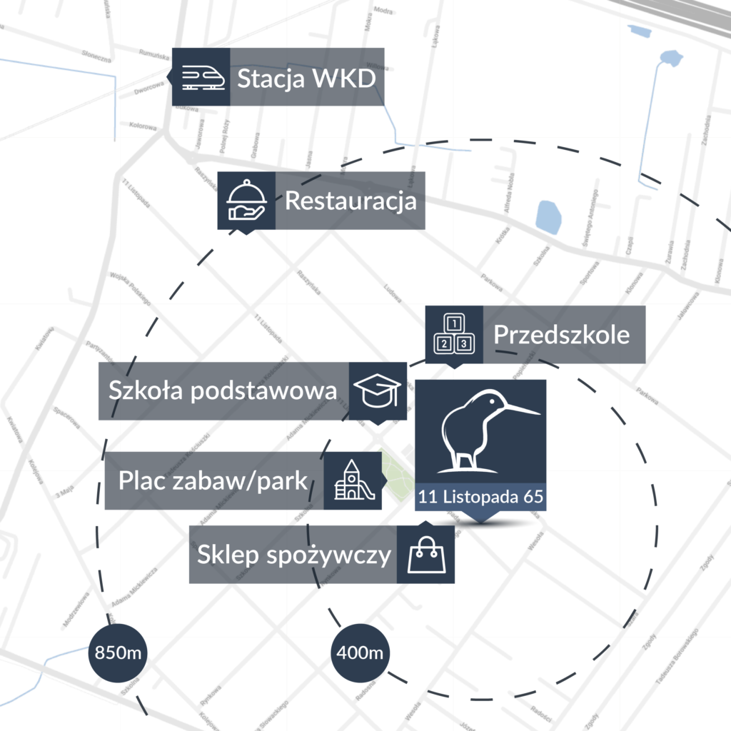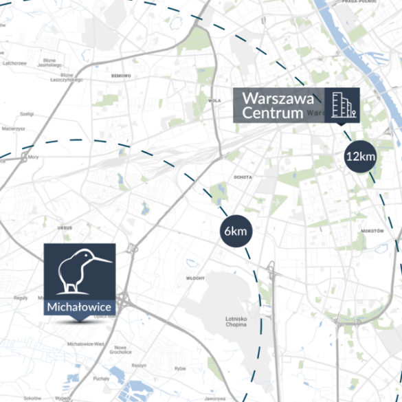 Inwestycja jest zlokalizowana w Michałowicach przy ul. 11 Listopada 65. Okolica ta jest doskonale skomunikowana. Do ścisłego centrum Warszawy można dotrzeć kolejką WKD lub samochodem w mniej niż 20 min. Swobodnie korzysta się z bogatej oferty handlowo-usługowej, rekreacyjnej i kulturalnej stolicy, a wiele ciekawych wydarzeń jest zawsze w zasięgu ręki. Nic nie stoi na przeszkodzie, by łączyć odpoczynek w cichym, spokojnym otoczeniu z pracą w dużym mieście. Podróżowanie po całym regionie ułatwia wygodny dostęp do kilku kluczowych ciągów komunikacyjnych – niedaleko m.in. wjazd na autostradę A2 oraz drogi ekspresowe: S7 i S8.